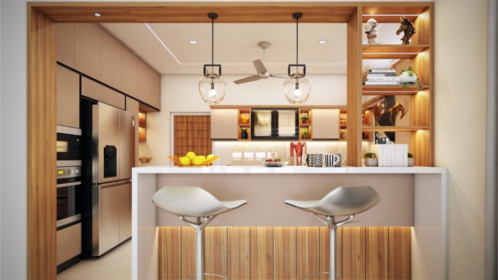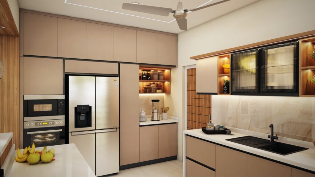 Discover the harmony of form and function in this contemporary kitchen interior, where warm textures meet clean lines to create a space that’s both inviting and sophisticated.